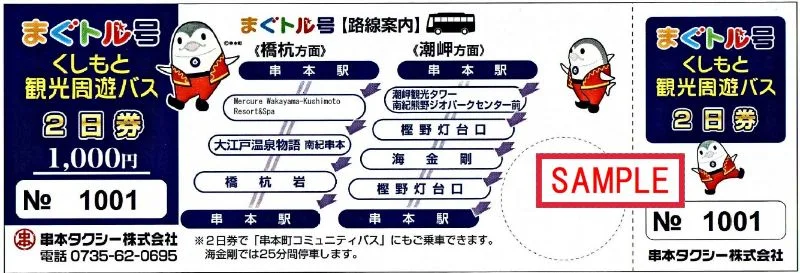 ※兌換後,您可以使用2日票搭乘串本町周遊巴士。 - 座位數量有限,若座滿,可能會拒絕搭乘。