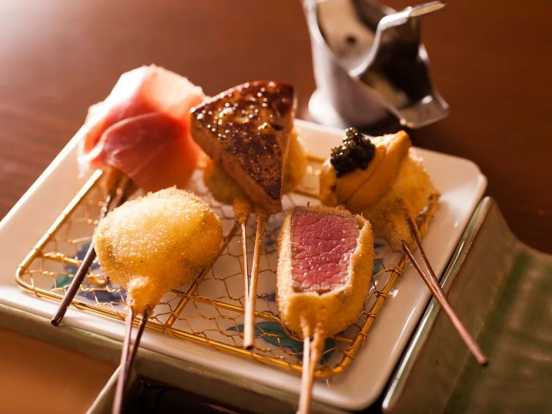本店使用當季食材以及菲力牛排、鵝肝等高級食材為您提供美味料理。 特別挑選以被譽為「油中之王」的棉籽油為基底,並進行獨家調配的用油。 請務必品嚐嚴選的食材,包括來自天草的天然鰻魚、不添加任何添加物的海膽、天然明蝦、菲力和牛等,並以獨特的「串炸」方式盡情享受這些美味。