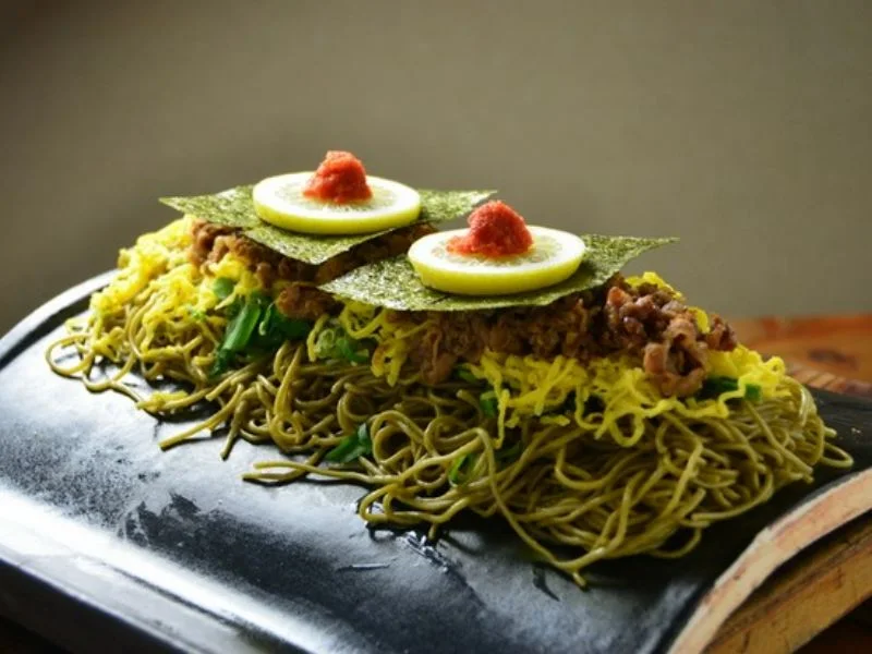 山口的鄉土料理-瓦片蕎麥麵,將茶蕎麥麵、肉、蛋絲、蔥花、海苔等配料,放在熱騰騰的黑色瓦片上,瓦片除了有良好的保溫性外,接觸瓦片的麵條會有脆脆的鍋巴,視覺與味覺的雙重享受,務必前來品嚐!