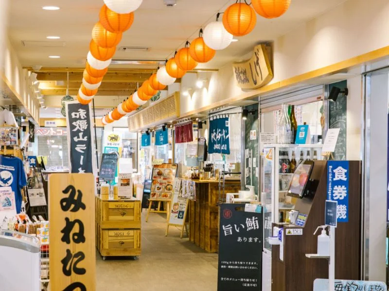 「Nigiwai-Ichiba」是一個銷售當地新鮮農產品和海鮮的區域,店鋪排列著提供生鮪魚、鮪魚料理、壽司、烏龍麵、丼飯、定食等各種美食。您可以在店鋪或直銷區購買的商品現場享用,還有一個木質平台,供您一邊享受美食,一邊眺望大海,放鬆休息。