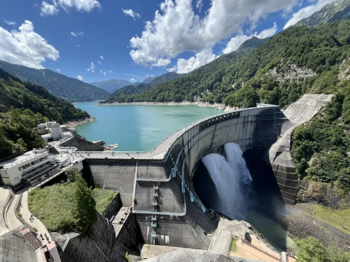 震撼的巨大景觀—通稱「黑四」(くろよん)的黑部水壩,不僅是日本最大的拱形混凝土水壩,也是日本最高的水壩之一。歷時約7年建造,位於立山黑部阿爾卑斯路線上,是著名景點。壯觀的水勢從水壩落下,洩洪時的景象尤為震撼,絕對不可錯過!