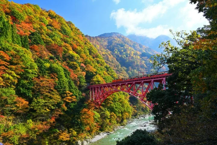 搭乘小火車(トロッコ)可欣賞壯麗的峽谷美景。春季可看到壯觀的殘雪牆,梅雨季節則有雲霧繚繞的神秘景色,秋季(10月至11月)則是楓葉盛開、攝影的最佳時機。