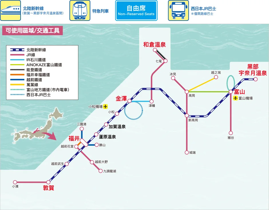 JR北陸地區鐵路周遊券適合小範圍旅遊,可在連續4日內無限次搭乘 JR 列車,輕鬆暢遊富山、石川、福井等北陸地區!
