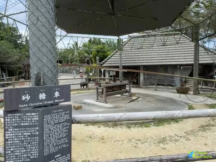 琉球村內有一個製糖工廠,裡面重現琉球時代的古老製糖方式,是由牛牽動石磨旋轉,將甘蔗榨汁的表演活動。
