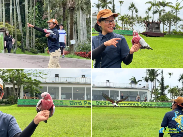 剛好遇到鳥類飛行表演。飼育員展示手上的鸚鵡,進行飛行的表演,可以近距離觀察鳥類飛行的樣子。