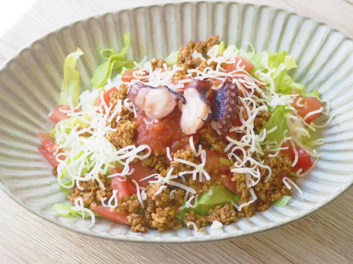 將白飯上舖上調味過的絞肉、起司、萵苣、番茄等蔬菜的料理。由於是將「塔可餅」的配料放在白飯上,經常被誤認為是墨西哥料理,但塔可飯可是源自沖繩的在地美食喔!