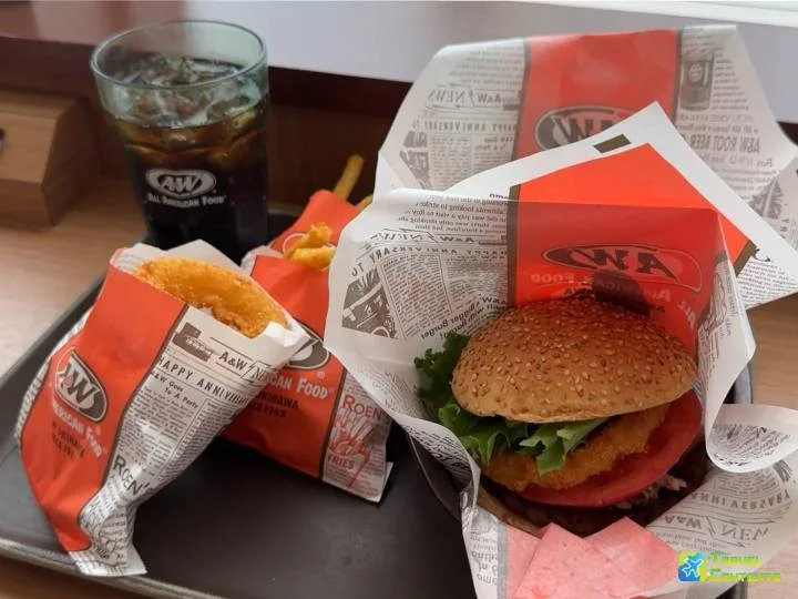 除了美國,AW漢堡的亞洲分店只在沖繩才有! 店內販售漢堡薯條等食品,餐點的飲料是搭配經典的麥根沙士。漢堡用料與份量完全不手軟,一口咬下,一口品嚐到肉汁、蔬菜、麵包的甜味,吃完超滿足!