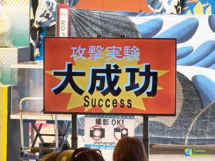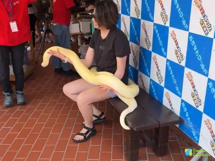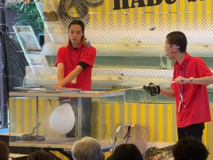 這邊的最大看點是「毒蛇表演秀」,要在現場讓你親眼見識蛇的攻擊力。活動開始前,會先展示蛇並簡單介紹蛇的構造。接下來,工作人員會準備兩顆氣球,一顆是普通的白色氣球,另一顆則是裝著溫水的藍色氣球。