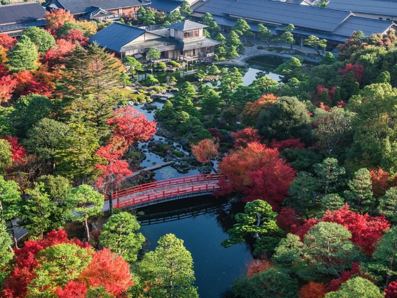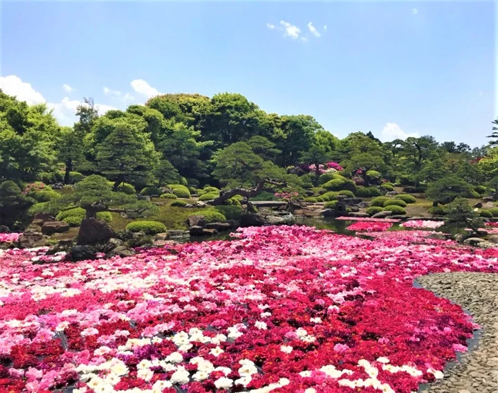 由志園濃縮出雲地區的地形特色,是象徵「出雲的微型花園」,園內種植高麗人蔘及250多種牡丹花。特定期間,更有三萬朵牡丹漂浮於池面的「池泉牡丹」花海,景象十分壯觀。池泉回遊式庭園展現四季繽紛的自然美景,每個季節皆有不同風情。