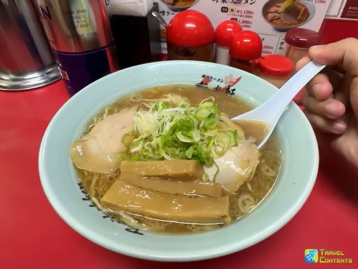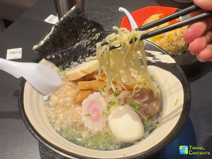湯頭使用了雞骨與豬骨,並與海鮮高湯結合成雙湯頭。麵體則是中細捲麵,吃到的每一口都充滿精髓。