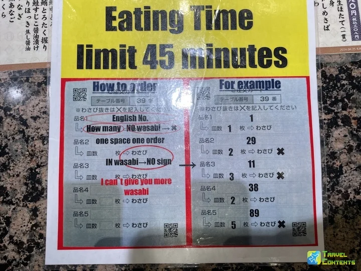 迴轉台上的品項都能直接取用,如果想加點菜單上的品項,將餐點號碼寫在菜單上交給師傅即可。