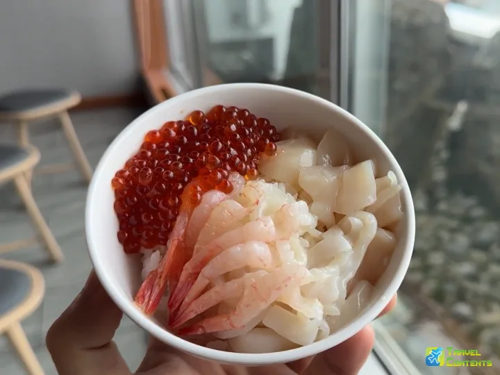干貝、花枝、甜蝦,新鮮到彷彿像是現撈,還有一顆顆晶瑩剔透的鮭魚卵,閃閃發光的樣子讓人迫不及待想要品嚐,每一口都能感受到海洋的鮮味。