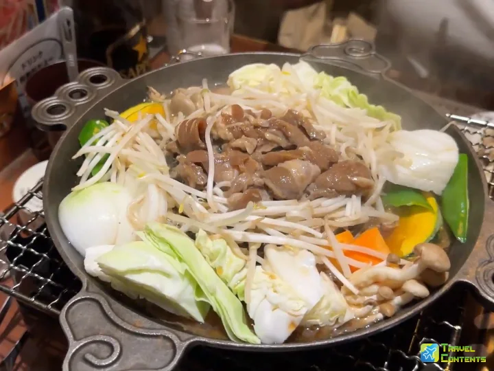 圓形鑄鐵烤盤中央擺上羊肉,鍋子邊緣則放上洋蔥、豆芽菜、高麗菜等配料,這就是成吉思汗烤羊肉。