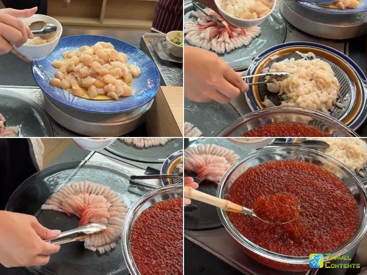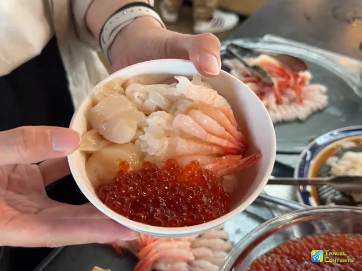 新鮮的鮭魚卵、干貝、花枝、甜蝦等,你都可以自由拿取,讓你從早上就能享受到北海道的鮮味。