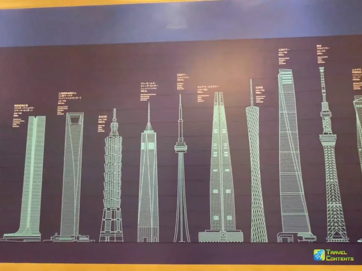 牆面上有世界高樓的介紹,突然看到熟悉的台北101(左三)。