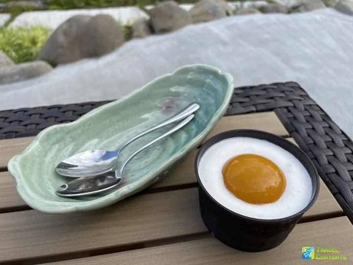 這個布丁蛋白濃郁不膩,蛋黃的部分是酸甜的芒果和百香果果凍,完美的搭配讓人忍不住想再點一份!