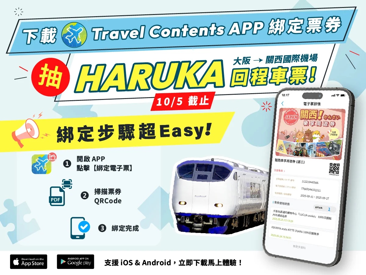 活動期間內,使用「Travel Contents App」成功綁定「關西樂享周遊券」即可獲得抽獎資格。