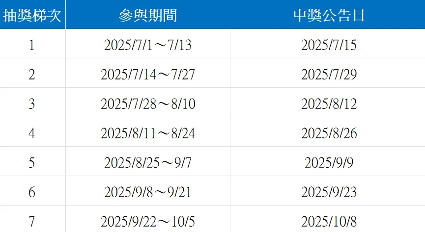 每雙週舉行一次抽獎,中獎名單將於該雙週結束後的隔週,公布於本活動頁面,並以 Travel Contents App 點數形式發放至得獎者帳號中。