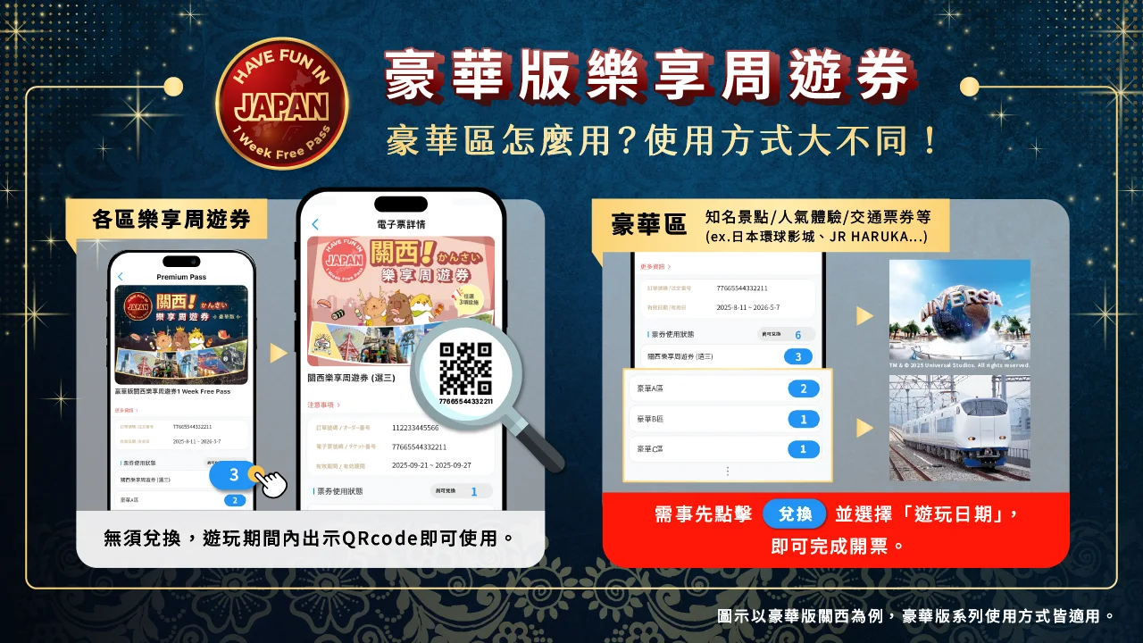 樂享周遊券的有效期間為您所選擇的連續7天遊玩日。期間內出示QR Code,即可直接體驗。使用前請務必先至各設施官網確認注意事項、營業時間及公休日等資訊,以利行程順利進行。