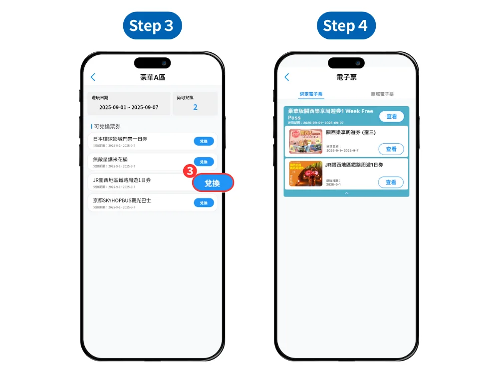 Step 3:從豪華A區中選擇心儀的商品,點選「兌換」,選擇「遊玩日期」,確認後就能得到電子票!