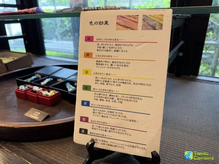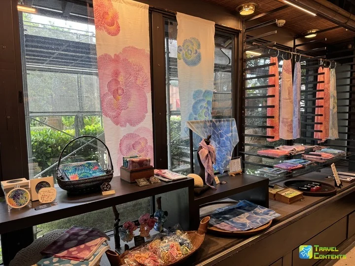 店內的1樓商店內展示著許多染布商品,一旁有座位可以坐著休息。