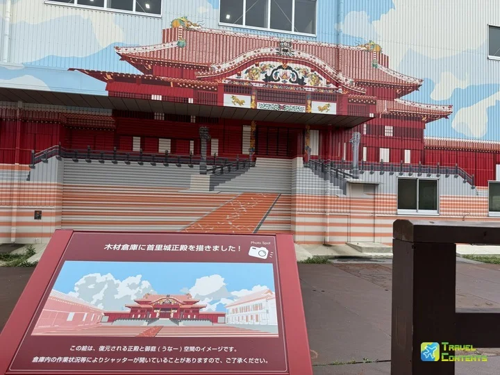 首里城內堆放木材的倉庫外牆有畫上復原後的想像圖。