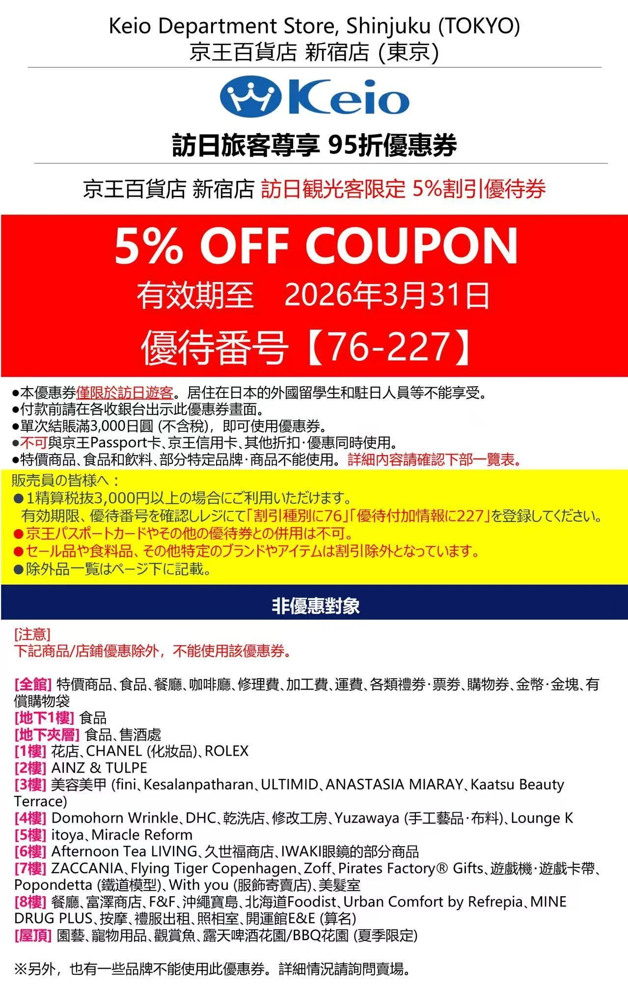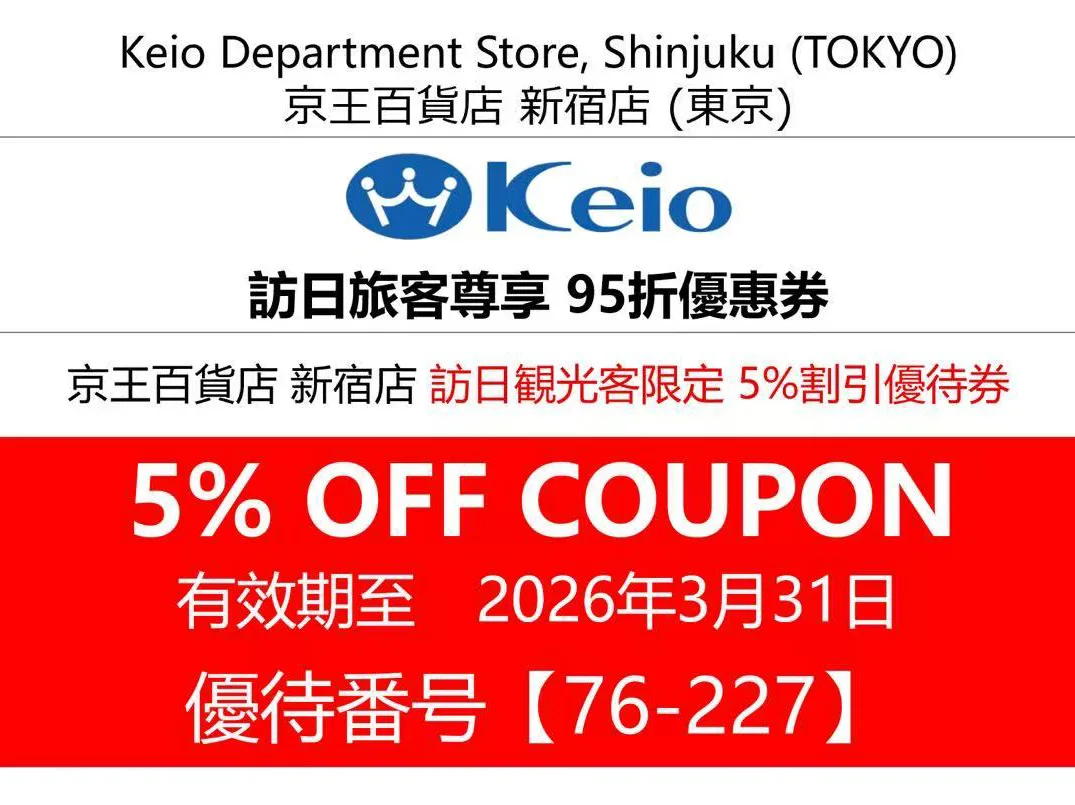 優惠券適用於京王百貨店 新宿店,單次結帳滿3,000日圓(不含稅),結帳前出示優惠券畫面,即享95折優惠。