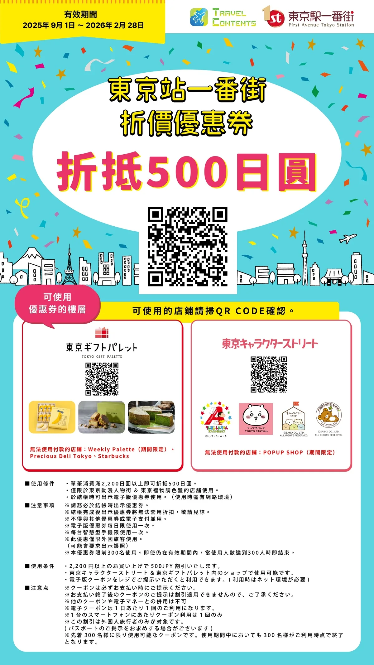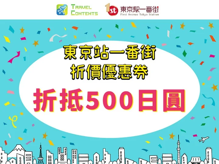 於東京站一番街消費單筆消費滿2,200日圓以上即可折抵500日圓。