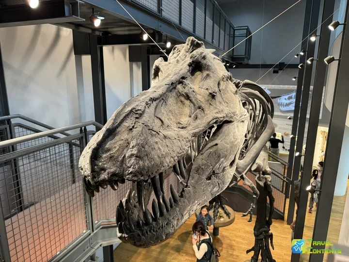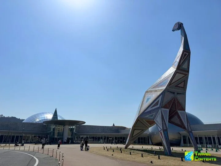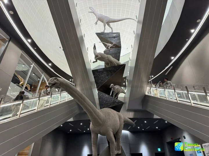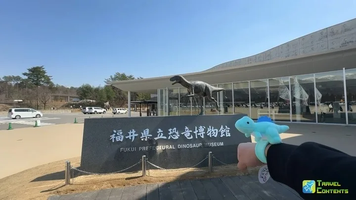 搭乘到「越前鐵道-勝山車站」下車,轉搭巴士,即可抵達充滿未來科技感的恐龍博物館,巨大幾何三角形構成的恐龍雕塑矗立在廣場中。
