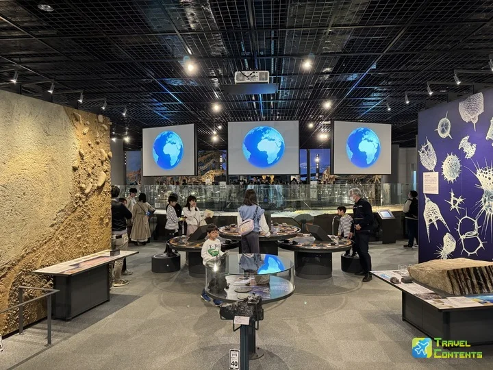 地球生命的起源是來自於海洋,透過影片,帶你更了解生物的起源與地球的歷史。中間的互動展示圓桌轉盤上展示了化石、堆積物、礦石等,手動旋轉圓盤對準桌上的偵測器,螢幕就會顯示相對應的說明。