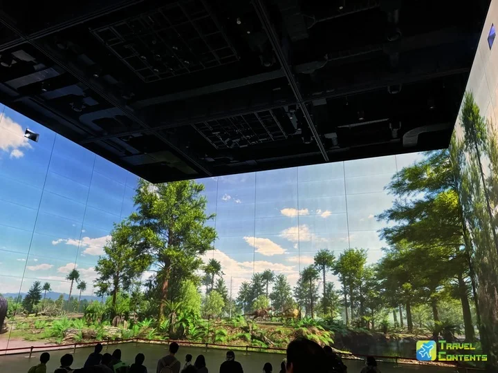 1樓的特別展示室內,有三面巨型螢幕牆壁,恐龍會在叢林間穿梭、生活,讓你沉浸式體驗當時恐龍還存在的環境。