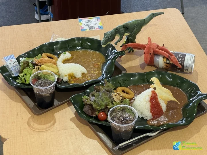 分別點了小福井巨龍咖哩,與岩漿咖哩,米飯特別用成龍與火山的樣子,用沙拉與恐龍餅乾營造叢林感,跟剛剛買的恐龍周邊合照,超級可愛!