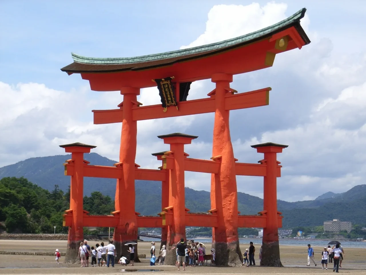 嚴島神社的大鳥居是最具代表性的象徵之一,主柱採用耐濕、防蟲性極佳的楠木製成,木材皆經過精心挑選。雖歷經多次重建,依然不減其人氣與魅力。大鳥居高約16公尺、重達60噸,採「不打地基」的工法,僅靠自重穩固佇立於海中。其類型為少見的「兩部鳥居」,比一般鳥居多了兩根袖柱支撐主柱,展現出穩定又莊嚴的姿態。