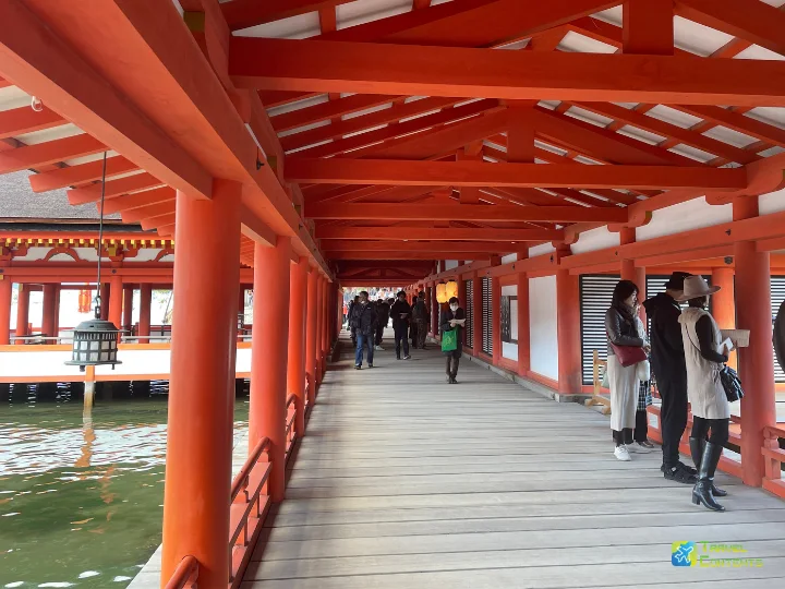 嚴島神社佔地廣闊、氣勢恢宏,走在整座朱紅色的迴廊上,內心也不禁隨之變得莊嚴沉靜被眼前壯麗的景色所震懾,沿著參拜動線緩步前行,每一處轉角都展現出神社獨特而迷人的風采。