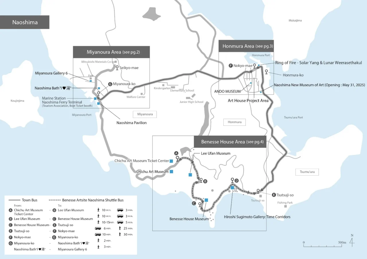 除了電動車的交通方式外,宮浦港港口一旁也可搭乘「直島町營巴士」,路線可抵達直島港(本村)與終點站杜鵑花山莊(Tsutsuji-so)。若想參觀倍樂生之家美術館、李禹煥美術館與地中美術館,可在杜鵑花山莊下車後,轉乘專屬的免費接駁車前往各美術館: