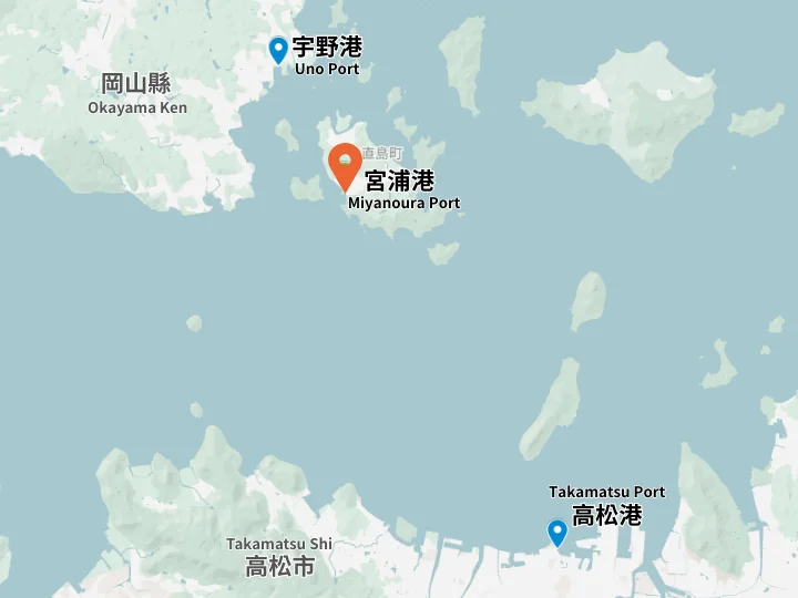 要前往直島的話,旅客可以從兩個主要地點搭乘渡輪前往直島:從高松港出發,渡輪航程約需1小時即可抵達直島的宮浦港;若從岡山縣的宇野港出發,則只需約30分鐘即可抵達宮浦港。