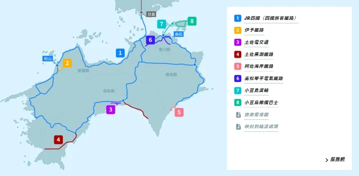 購買四國鐵路優惠券即可無限次搭乘8種交通工具,包括JR四國、伊予鐵路、土佐電交通等路線,還涵蓋小豆島渡輪與小豆島橄欖巴士,讓旅客抵達小豆島後也無需擔心交通的問題。