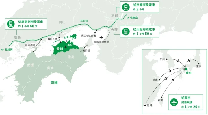 前往瀨戶內地區,有幾種便捷的交通方式。從桃園國際機場出發,你可以搭乘直飛班機抵達高松機場;若從大阪車站出發,可選擇搭乘JR山陽新幹線至岡山車站,再轉乘至高松車站,或是也可以從大阪搭乘高速巴士直達高松市。