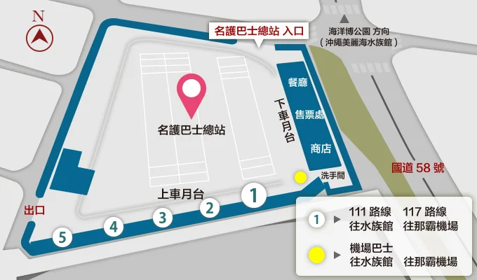 - 巴士路線(二):從名護巴士總站出發,於1號月臺或黃點標示處上車,至「記念公園前」站,走路約10分鐘即可抵達。