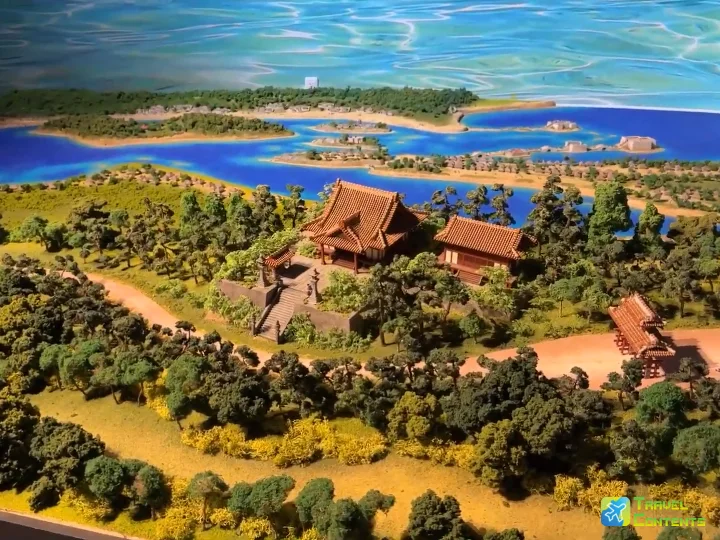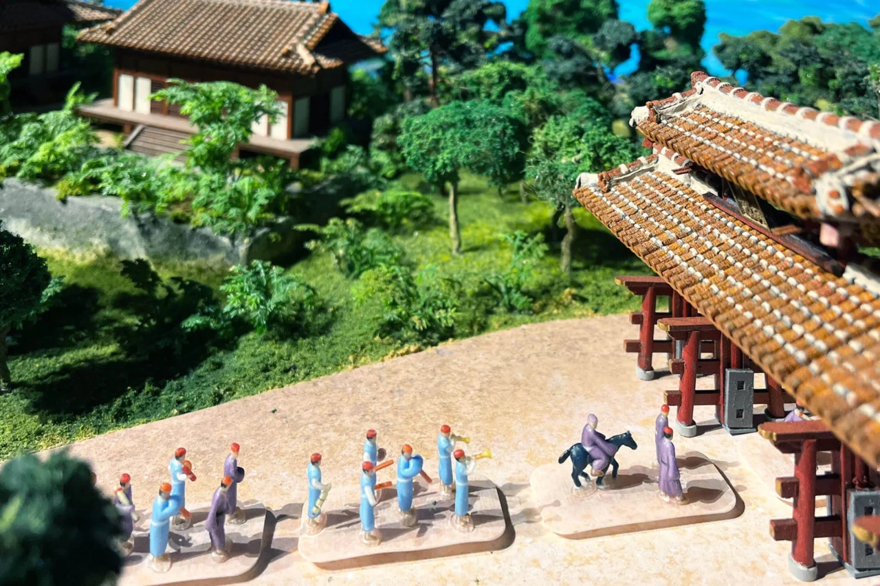 這裡以「首里那霸全景圖」做為參考去製作迷你模型,還原了當時中國使節團來訪,前往首里城的樣貌。