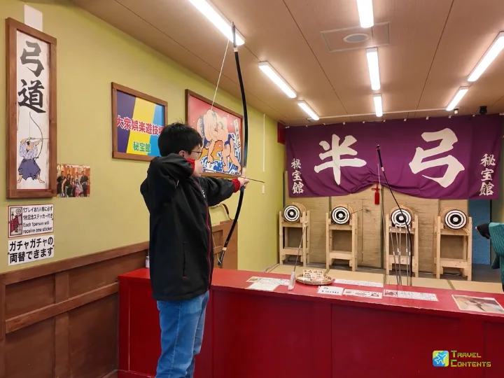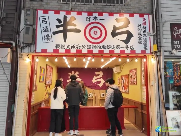 弓道場位於通天閣本通商店街內,據說是日本戰後大阪府認證的1號店,可以在此體驗到日本傳統射箭弓道場。拿起半弓,架上箭矢,瞄準前方箭靶,一起感受箭矢飛出的瞬間快感!