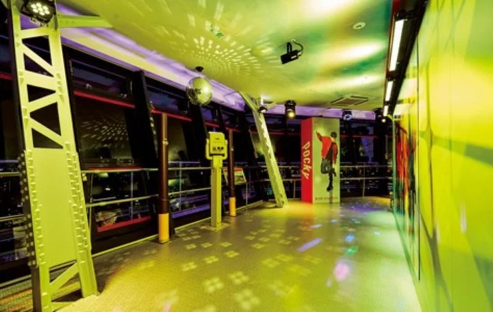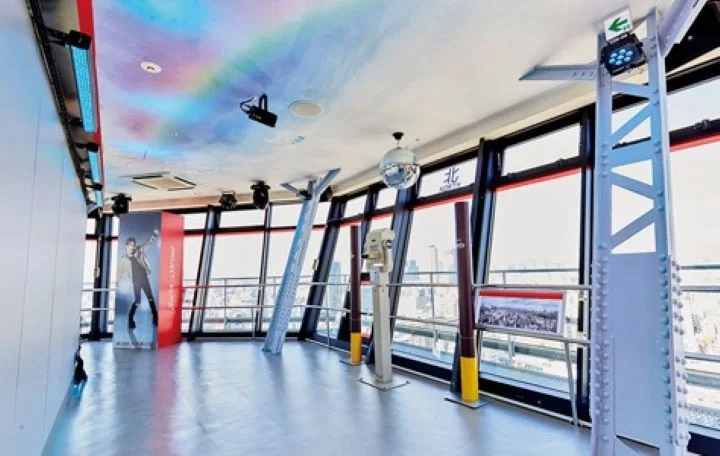 4樓氛圍與5樓截然不同,彩色燈光投射在天花板、牆壁與柱子上,給人一種夢幻的感覺!牆壁還貼上了不同的日本美味棒包裝圖案,而到了夜晚的光之展望臺又是另一種模樣。七彩燈光會配上鏡球,展望臺搖身一變成了disco舞廳。