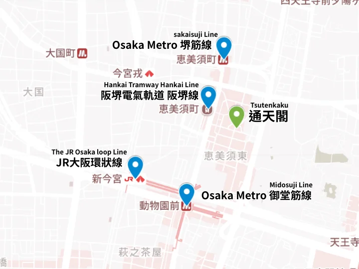 • 搭乘Osaka Metro堺筋線至「惠美須町站」,步行約3分鐘