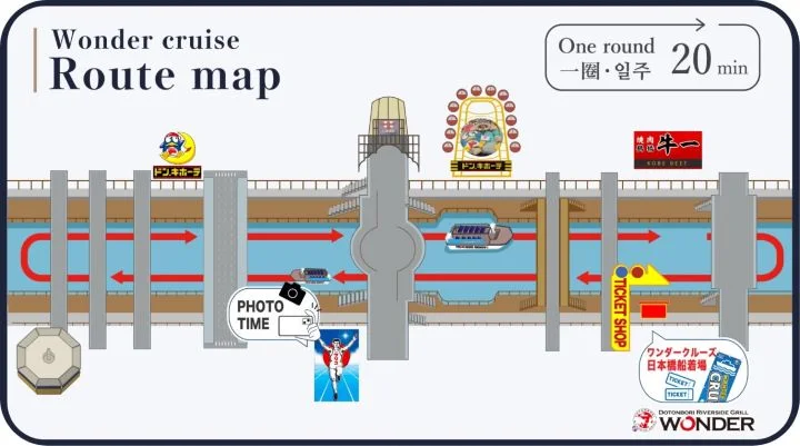整趟船程大約20分鐘,沿途能以不同視角欣賞道頓堀街景,路線會經過戎橋、道頓堀橋、新戎橋、大黑橋等著名橋樑,最後繞回出發點。