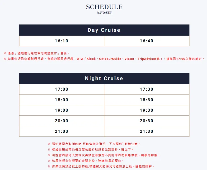 Wonder cruise航班分為2個主要時段,下午時段為16:10、16:40,夜間時段從17:00開始,每半小時一班,而如果你使用關西樂享周遊券,記得只能搭乘17:00以後的班次喔! 另外,周一至周三的航班僅開放給有預約的旅客,其他天則會以已預約客人為優先搭乘,如果當天沒預約但仍想搭乘的話,可能就要依現場狀況決定,船上若無客滿就能搭乘!