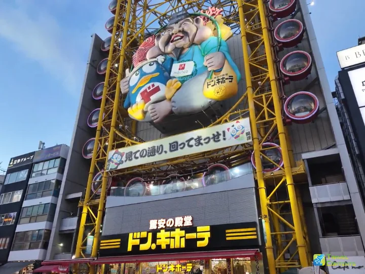 來到道頓堀的第2大亮點,就是唐吉訶德道頓堀店,金光閃閃的外觀遠遠就能認出!從船上看,可以一覽大摩天輪「惠比壽塔」,近距離看真的非常壯觀。逛街時,也很推薦前往搭乘摩天輪,從空中欣賞道頓堀的熱鬧風景,窗戶內也還有好多唐吉訶德企鵝,實在是超級可愛~!
