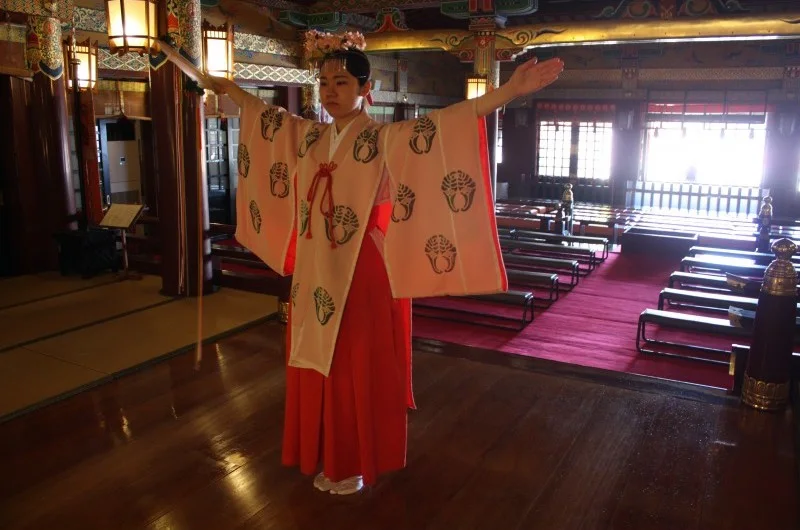日本神社內掌管祭祀的巫女,伴隨優雅的歌曲翩翩起舞的跳舞儀式。
