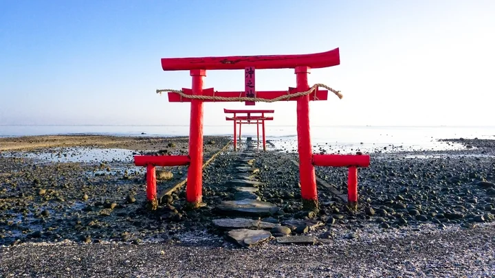 佐賀的「大魚神社」也有海上鳥居!漲退潮最大潮差達6公尺,漲潮時海水會淹到鳥居的上半部,退潮時便可看見完整的海中三鳥居,近中遠的三鳥居就像是通往海中道路的入口,搭配夕陽與海景,充滿神秘感,是許多攝影愛好者的必去景點。